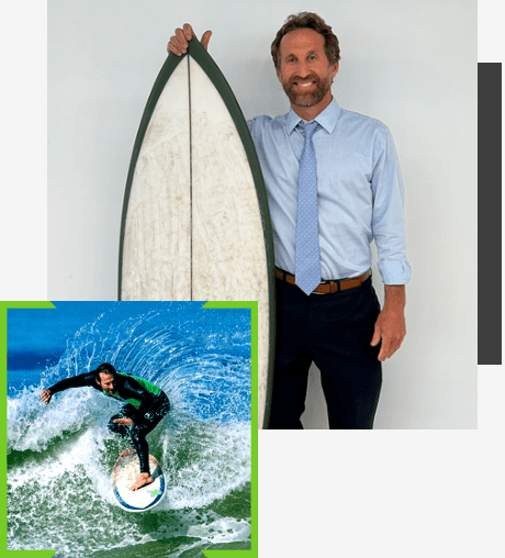 proven to help overcome anxiety. Attorney Osten sees the ever-changing ocean waves similarly to the ever-changing dynamics of a jury trial, so every minute spent on the surf better prepares him for the next trial, and the other way around.
